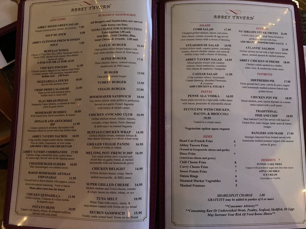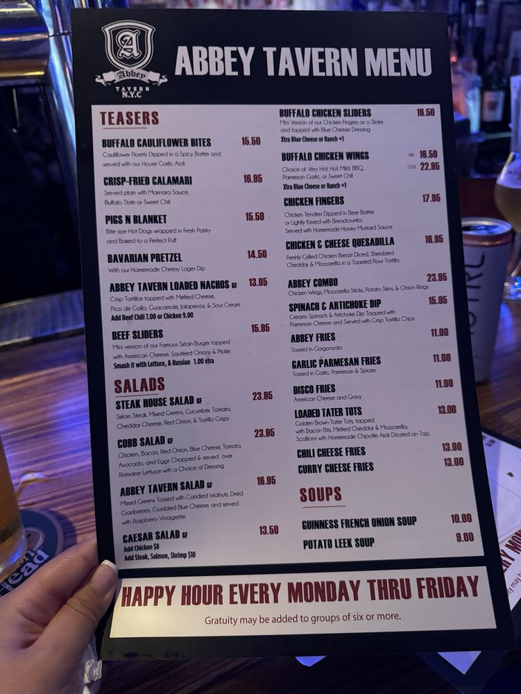 Abbey Tavern at 354 3rd Ave in New York offers a wide range of menu options in the categories of chicken wings, American cuisine, and burgers. The restaurant provides various utilities such as delivery, takeout, and catering services, making it convenient for customers. With many vegetarian and pescatarian options available, Abbey Tavern caters to a diverse range of dietary preferences. The establishment features a full bar, happy hour specials, and outdoor seating, creating a vibrant and enjoyable atmosphere for guests. Customers have praised the friendly staff, the extensive drink selection, and the delicious dishes such as the sirloin steak frite and Abbey chicken supreme. Overall, Abbey Tavern is a great spot to dine with friends or family while enjoying quality food and excellent service.